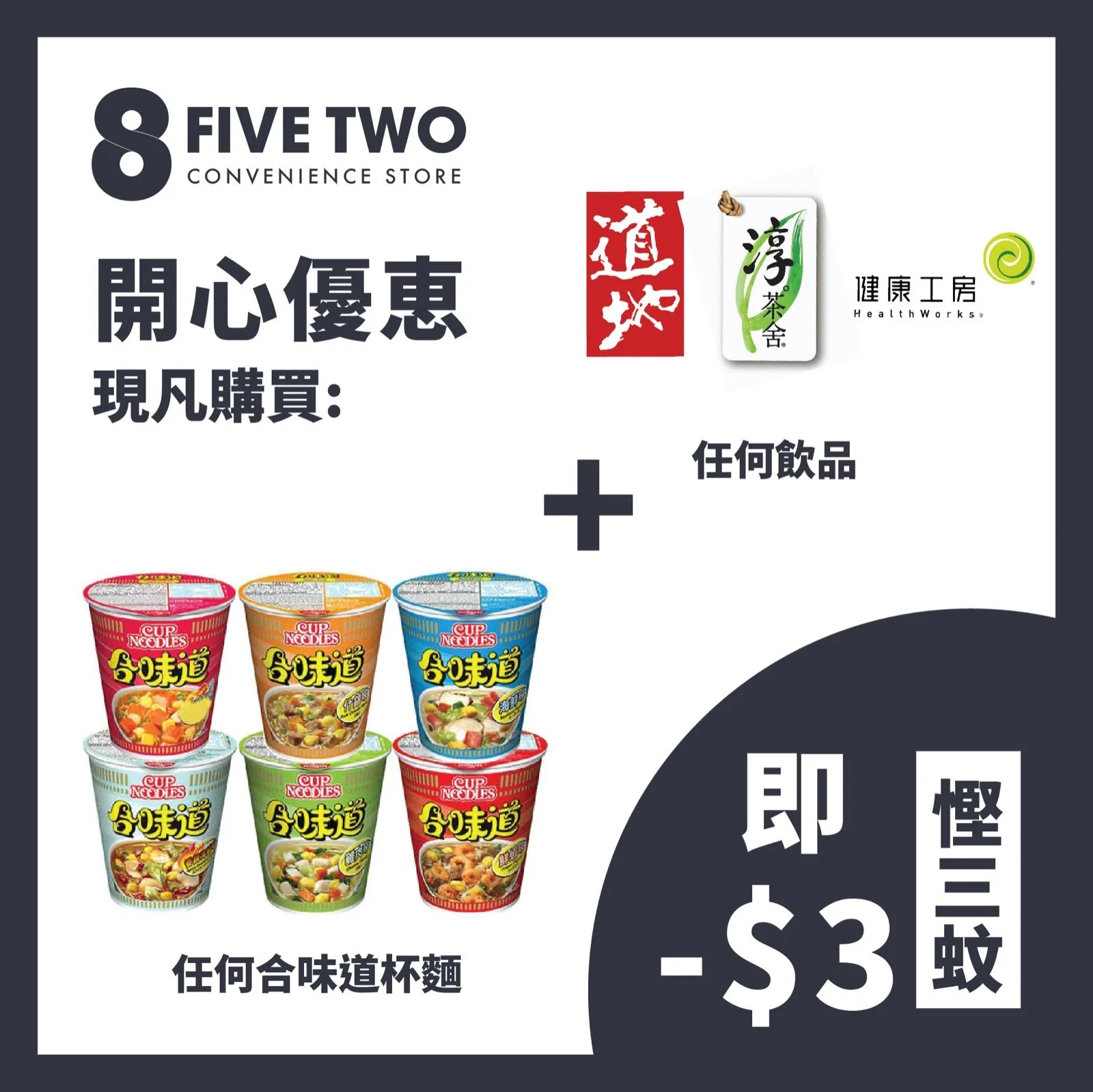 現場購買任何合味道杯麵加任何道地淳,茶社,健康工房即減$3
